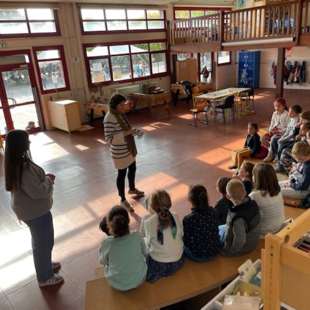 Première escale dans une école élémentaire, avec deux groupes successifs d’enfants — d’abord les grands, puis les petits.